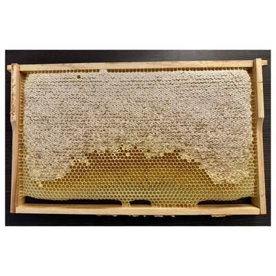 Die Waben wurden nicht aus dem Holzrahmen herausgeschnitten und so komplett eingefroren. Das Einfrieren schadet dem Honig überhaupt nicht, sorgt aber dafür, dass der Honig lange Zeit flüssig bleibt und nicht kandiert.