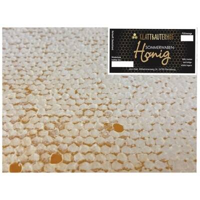 Die Waben wurden aus dem Holzrahmen herausgeschnitten und portioniert (710g - 1.160g) eingefroren. Das Einfrieren schadet dem Honig überhaupt nicht, sorgt aber dafür, dass der Honig lange Zeit flüssig bleibt und nicht kandiert.